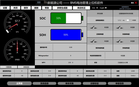 软件启动后,在界面下方是5大模块的切换按钮,首次启动软件,默认进入“主界面”页面,在该页面里,可以进行CAN设置,通过CAN连接电池组设备,进行实时的充放电测试,实时柱状图和曲线展示,Bootloader,历史数据导出等。